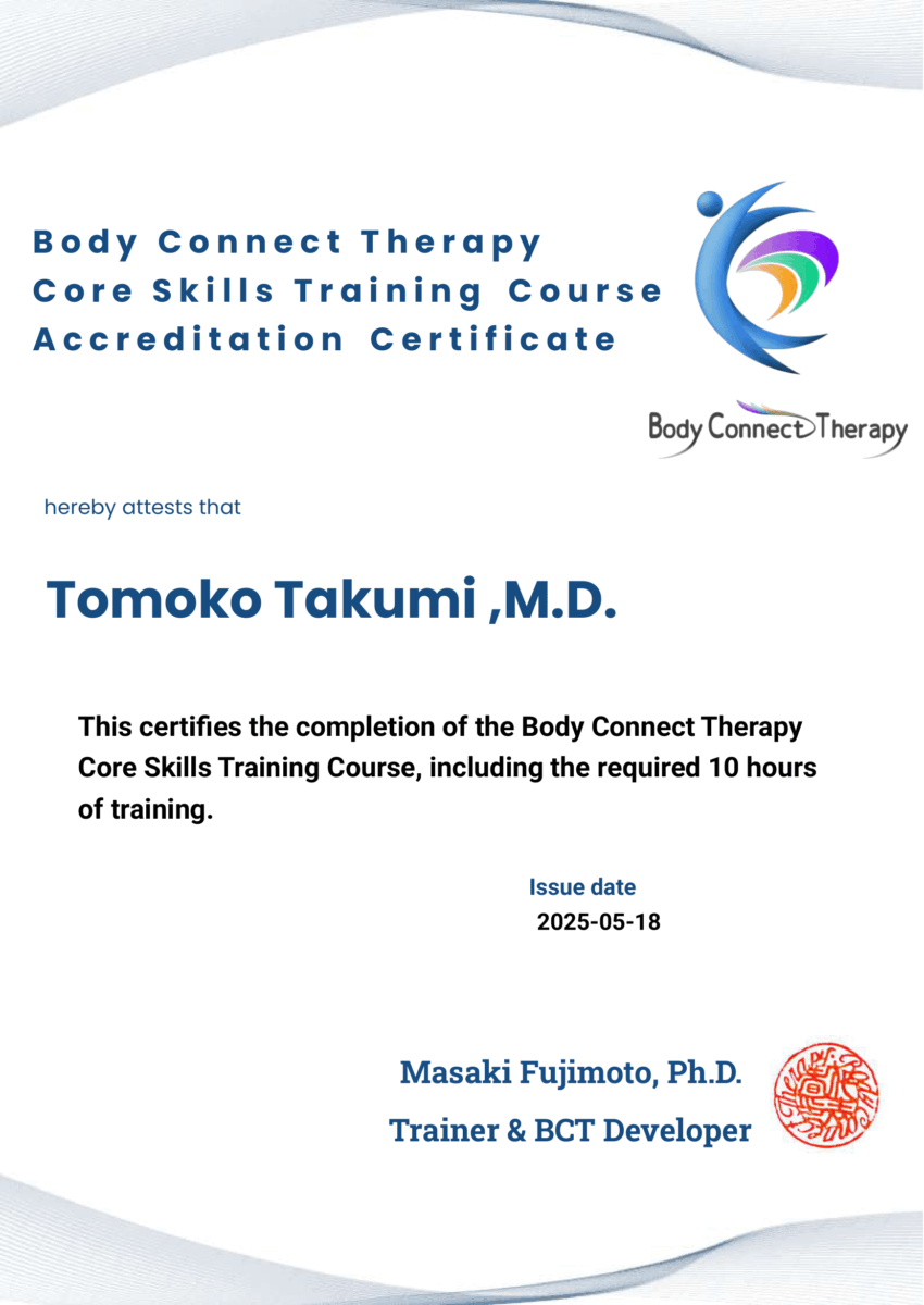 当院ではトラウマ、不安障害等の症状に対して Body connect therapy を診療に取り入れております。詳しい内容につきましては、お問い合わせください。